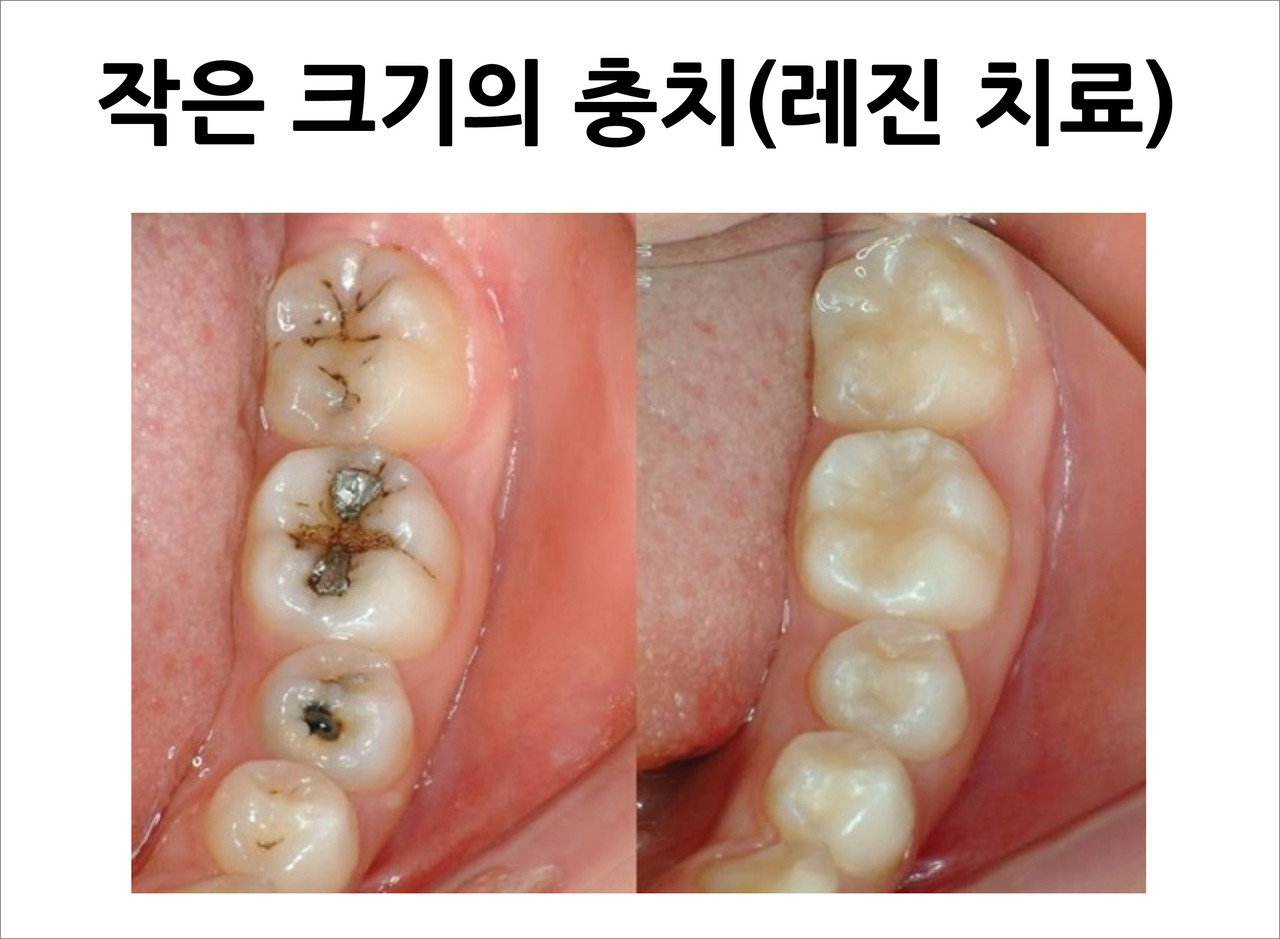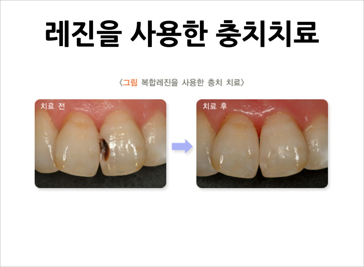 레진은 치아색이 나는 심미적인 수복물로 충치의 범위가 크지 않은 경우에 주로 사용됩니다.