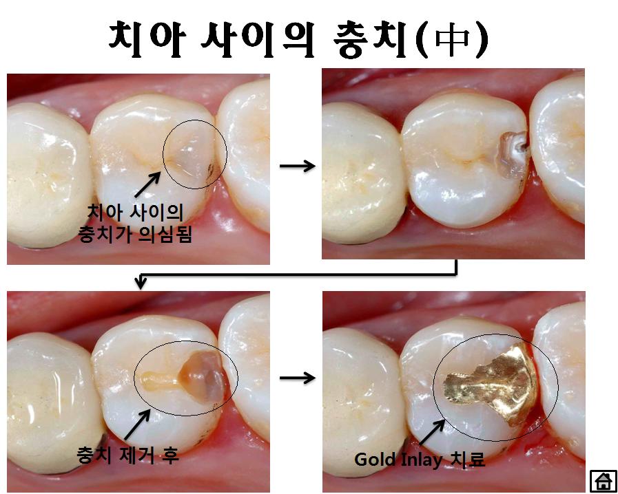 충치 부위가 넓거나 씹는 힘이 강한 어금니 부위에 적합한 골드 인레이는 인체에 무해하며 부식이 없고 강도와 경도가 자연치와 유사합니다.