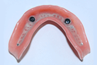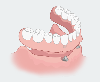 앞쪽 잇몸에 임플란트를 2~4개를 심은 뒤 바(bar)나 자석, 똑딱 단추와 같은 연결 장치를 사용해 틀니를 끼우기 때문에, 입 안에서 틀니가 빠질 염려가 없고 질긴 음식도 한결 씹기 편해집니다. 심는 임플란트의 개수가 적은 만큼 전체 임플란트에 비해 비용 부담이 적고, 전체틀니보다는 음식물을 씹는 느낌이 좋으며, 잇몸에 상처도 적게 나는 편입니다. 하지만 임플란트 틀니의 경우에도 점진적인 잇몸뼈 흡수(구치부 어금니부위의 치조골 손상)가 진행되기 때문에 임플란트와 틀니의 장점을 가지고 있는 임플란트 틀니는 담당 주치의의 충분한 설명과 상담 후에 진행하시는 것을 추천 드립니다.